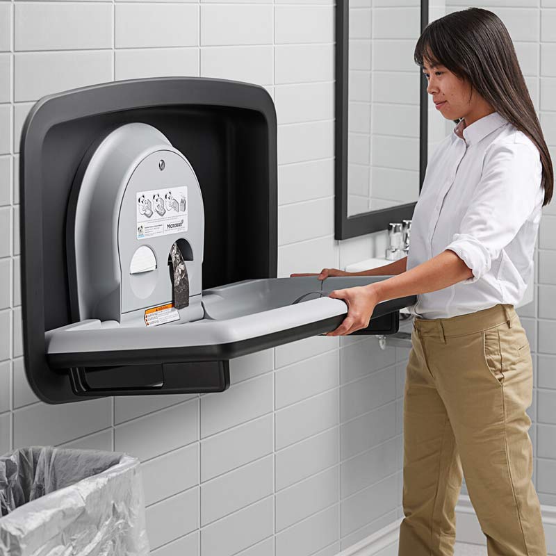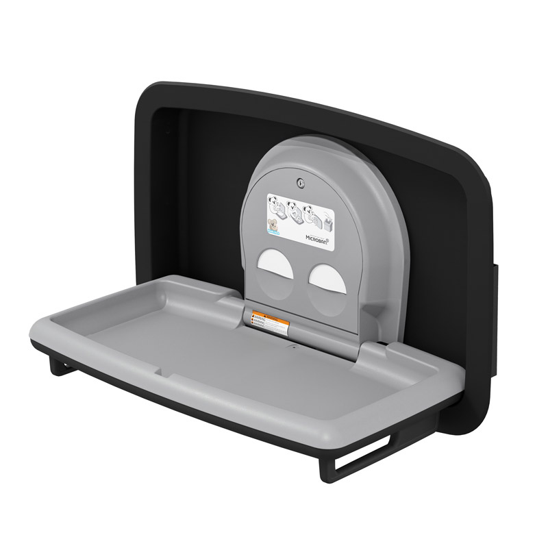 CAMBIADOR DE PAÑALES EMPOTRABLE HORIZONTAL FABRICADO CON UNA ESTETICA MODERNA CON FRENTE DE ACERO INOXIDABLE EN COLOR NEGRO MATE E INTERIOR EN POLIPROPILENO CON PROTECCION ANTIMICROBIANA MICROBAN™.