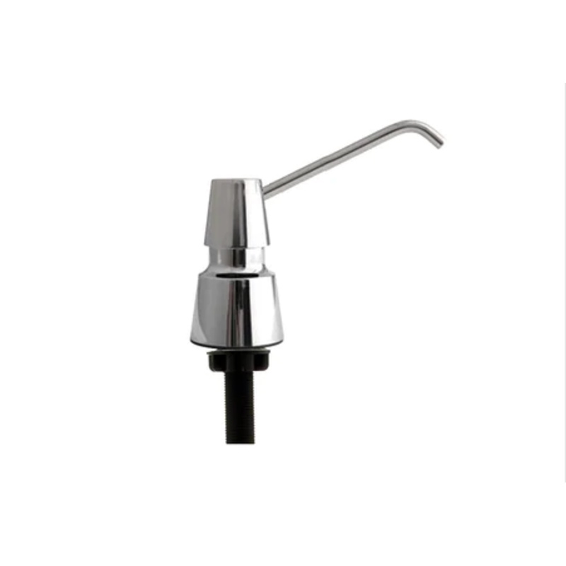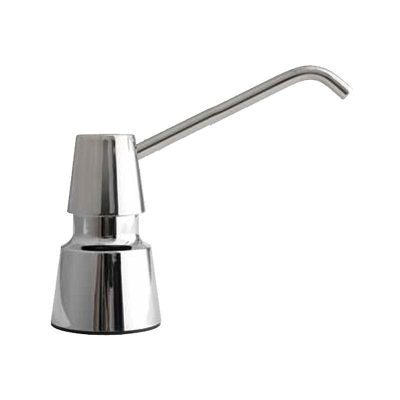 DISPENSADOR MANUAL DE JABON LIQUIDO DE MONTAJE EN ENCIMERA CON PISTON Y PICO FABRICADO DE ACERO INOXIDABLE CON ACABADO PULIDO BRILLANTE.